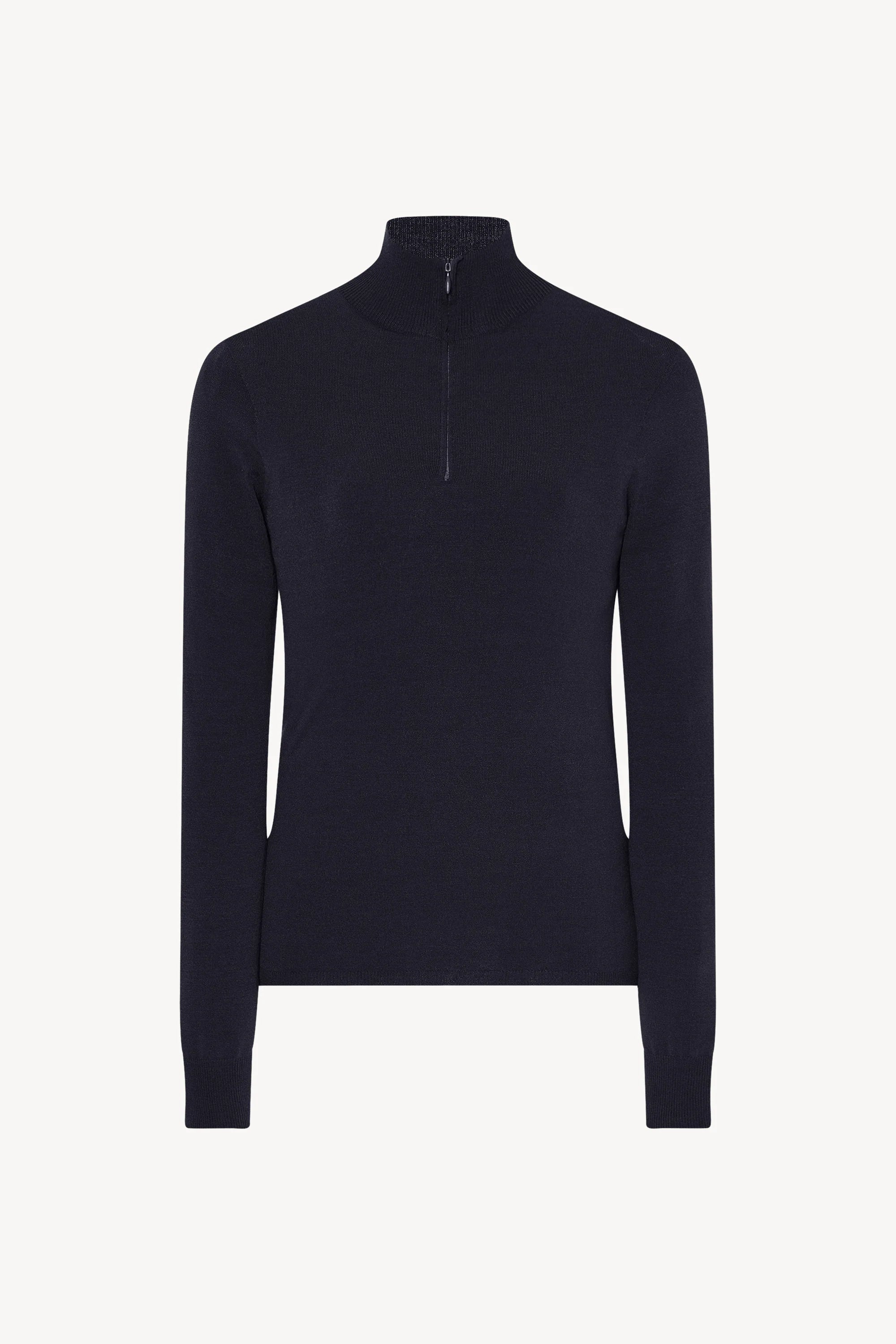 Long-sleeved turtleneck sweater in ultrasoft stretch jersey with slim fit, front half-zip closure, and ribbed neckline, cuffs, and hem.