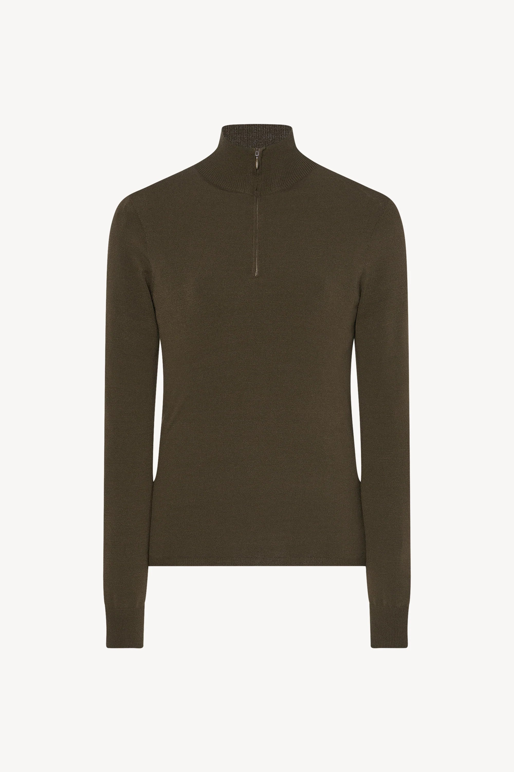 Long-sleeved turtleneck sweater in ultrasoft stretch jersey with slim fit, front half-zip closure, and ribbed neckline, cuffs, and hem.