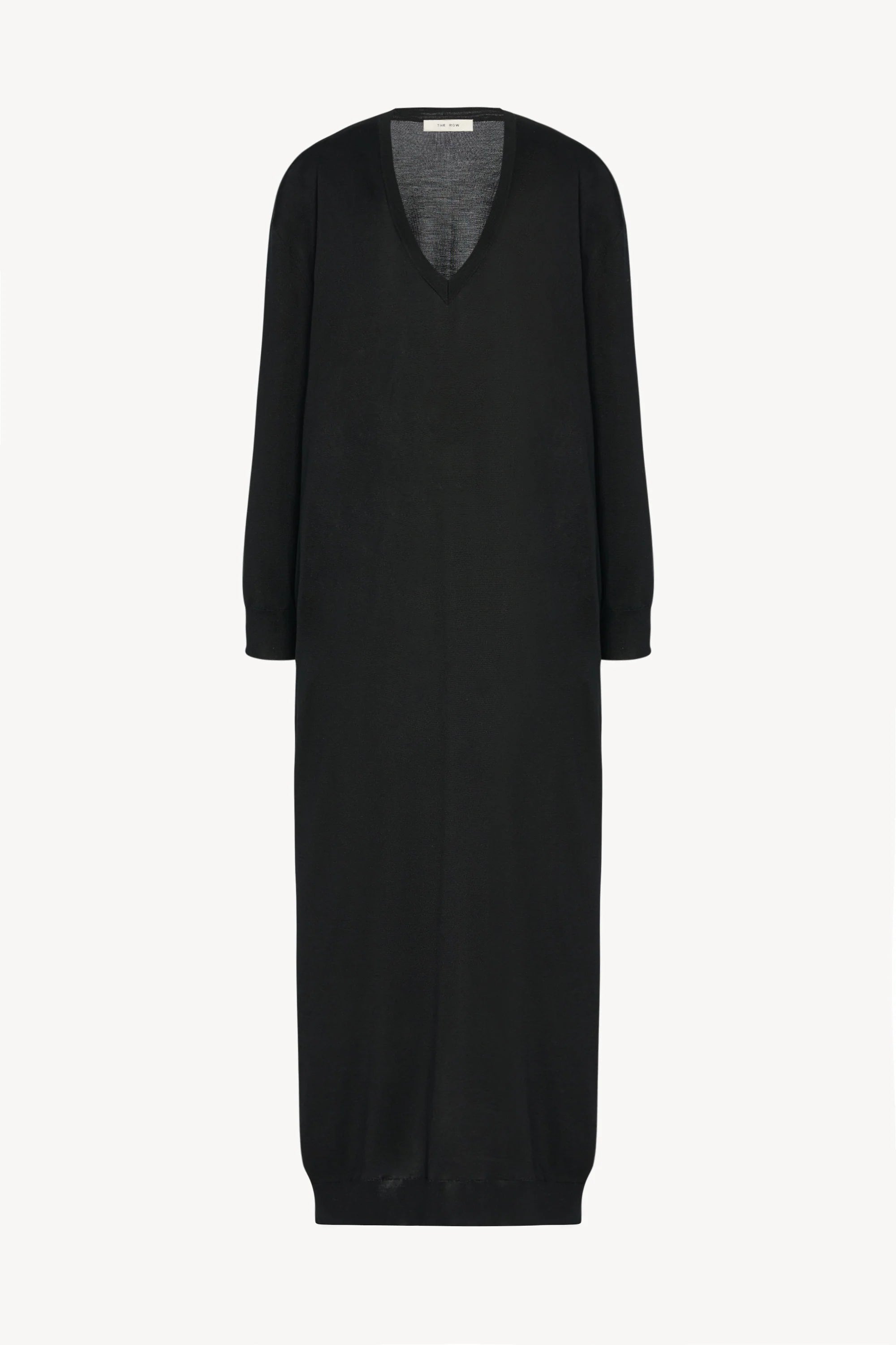 Ankle-length long-sleeved dress in finely knit silk with relaxed silhouette, deep v-neck, and ribbed neckline, cuffs, and hem.