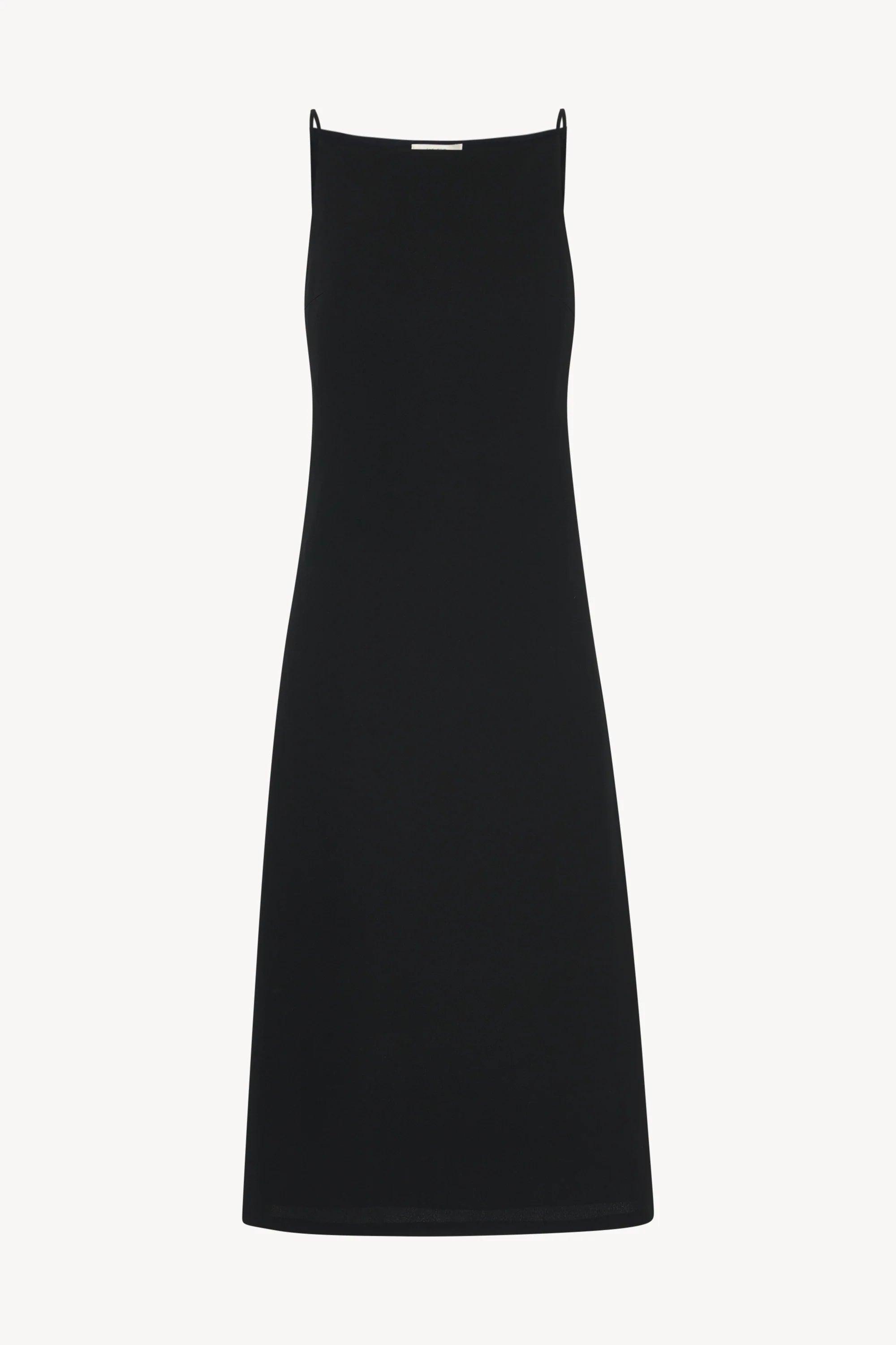 Ankle-length sleeveless dress in crisp, lightweight silk with slightly flared silhouette and straight neckline.