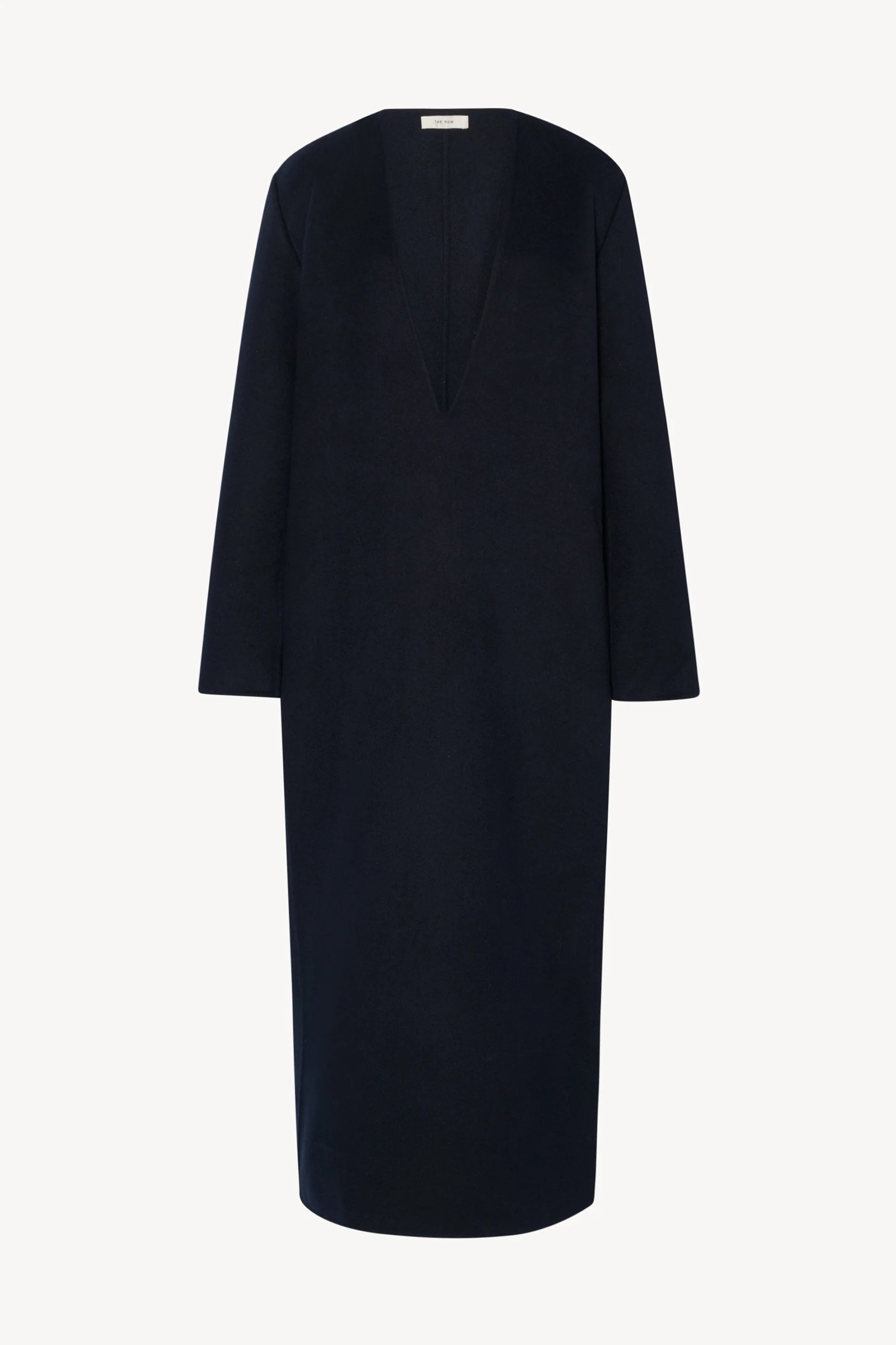 Ankle-length dress in lightweight double-faced cashmere with slightly oversized fit, deep v-neckline, and side seam pockets.