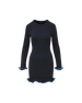 An everyday staple—with a flirty twist. Crafted from softly ribbed stretch cotton in navy, the Baranova mini dress features a slim, body-skimming fit with lettuce-edge ruffles at the cuffs and hem. A clean crew neckline, long sleeves, and contrasting light blue piping complete the look. Perfect from day to date night—pair it with flats, sneakers, or heels.