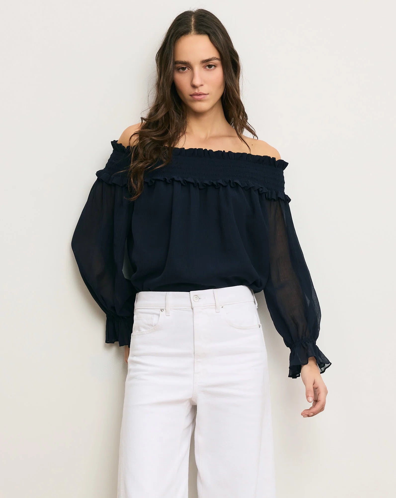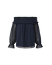 Crafted from sheer cotton-silk crinkle chiffon, the navy Callum top is our modern take on the bohemian blouse. Shirring at the neckline creates a flattering off-the-shoulder silhouette while soft bishop sleeves finish with a decorative flounce at the cuffs. Airy and romantic, it also features a lined bodice for coverage. Dress it down or dress it up—it's a perfect day-to-night top.