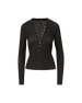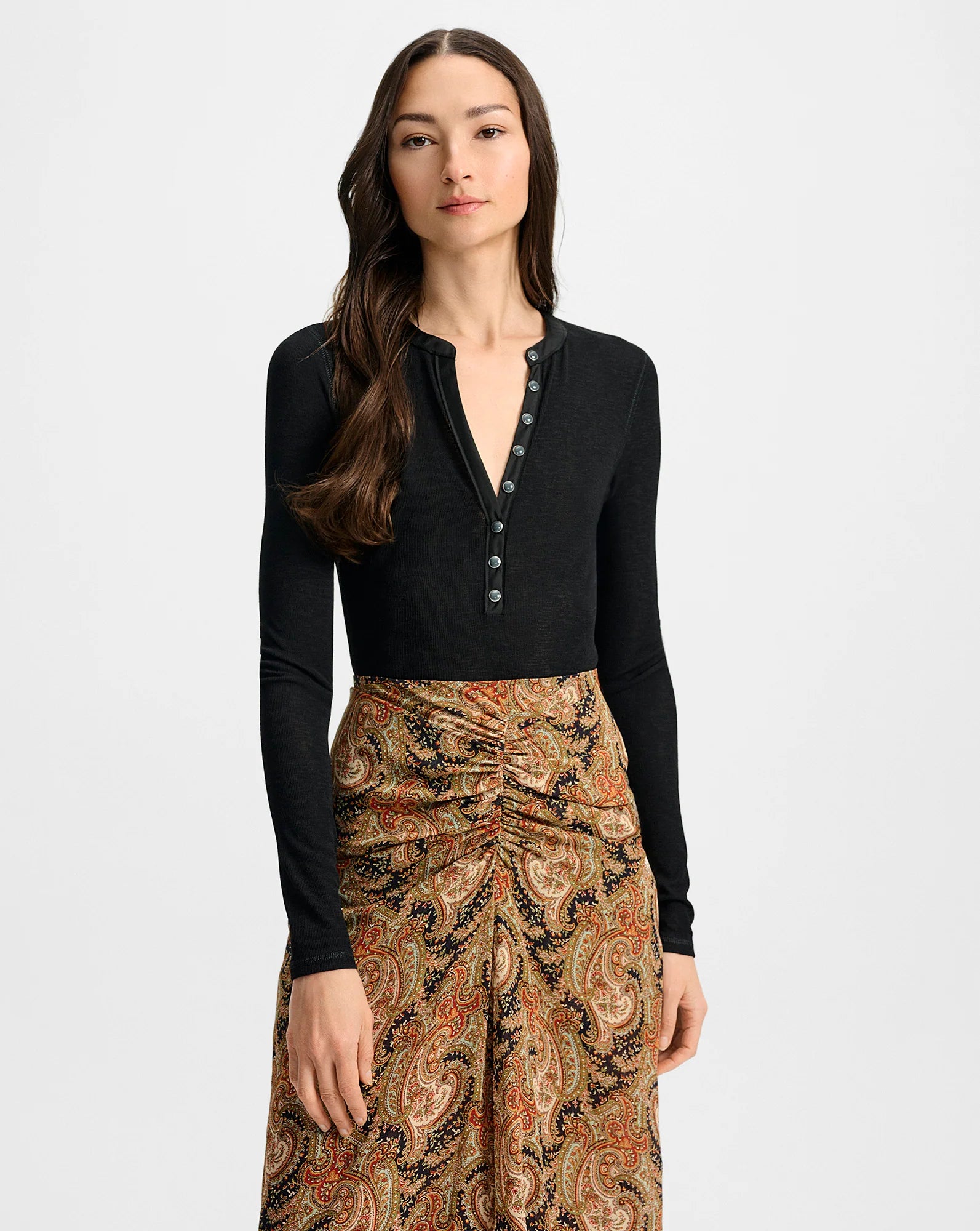 A foundational piece you’ll reach for again and again. The Drexler henley long-sleeve shirt is crafted from a delicate, semi-sheer stretch rib knit that softly hugs the body for a slim, flattering fit. A satin-trimmed deep V-neckline and placket add subtle contrast and shine, finished with stone snaps for a modern touch. Tuck into your favorite VB denim for polished ease.