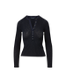 A foundational piece you’ll reach for again and again. The Drexler henley shirt is crafted from a delicate, semi-sheer stretch rib knit that softly hugs the body for a slim, flattering fit. A satin-trimmed deep V-neckline and placket add subtle contrast and shine, finished with stone snaps for a modern touch. Tuck this navy tee into your favorite VB denim for polished ease.