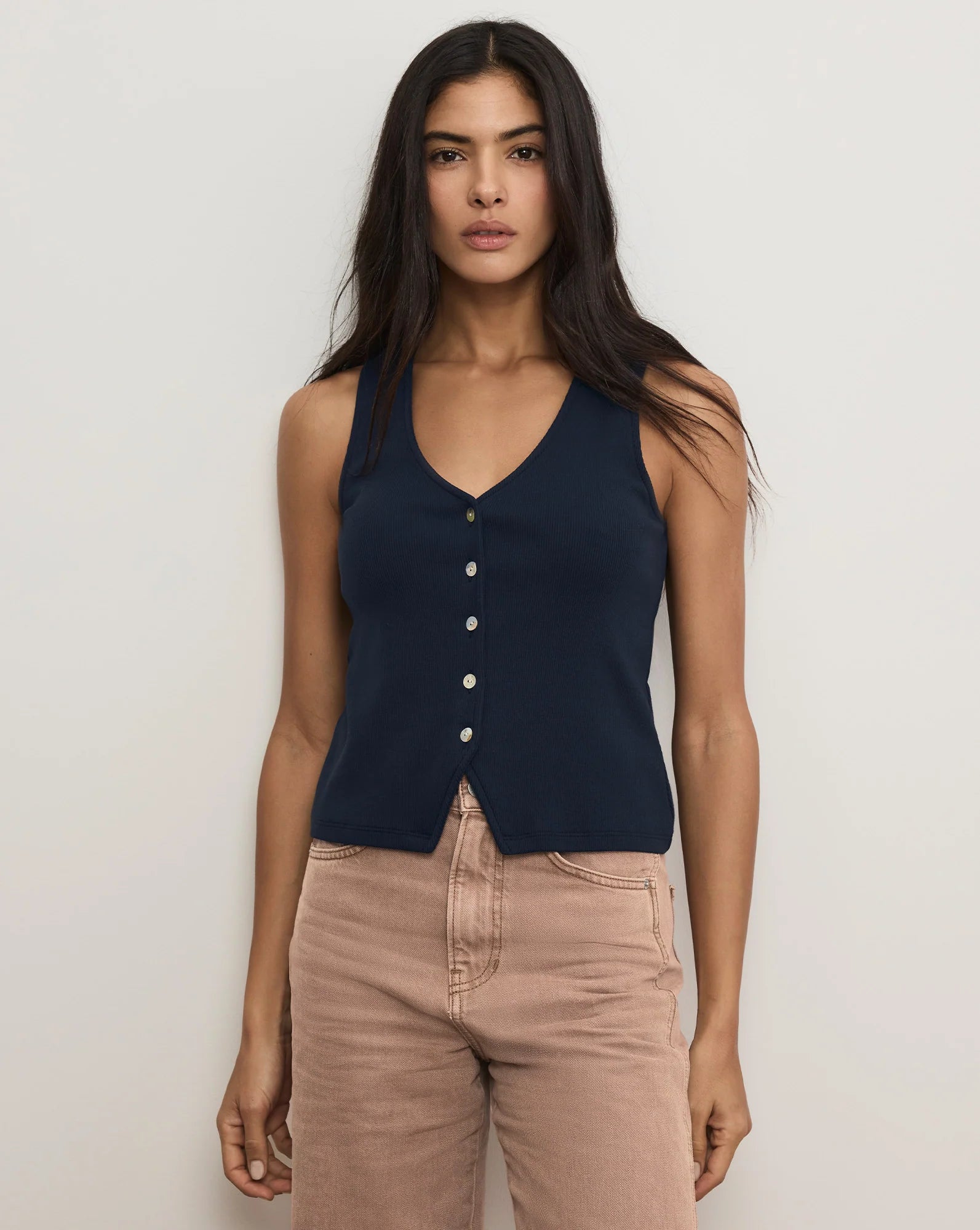 The ease of a tee, the polish of a vest. A VB favorite, the Hoorne button-down tank top is crafted from soft stretch cotton and finished with white pearlized buttons. It features a deep V-neckline, subtle ribbing, and an angled cutaway hem for a relaxed take on a tailoring favorite. Wear it as is with jeans or under a blazer... it’s perfect anytime, with anything.