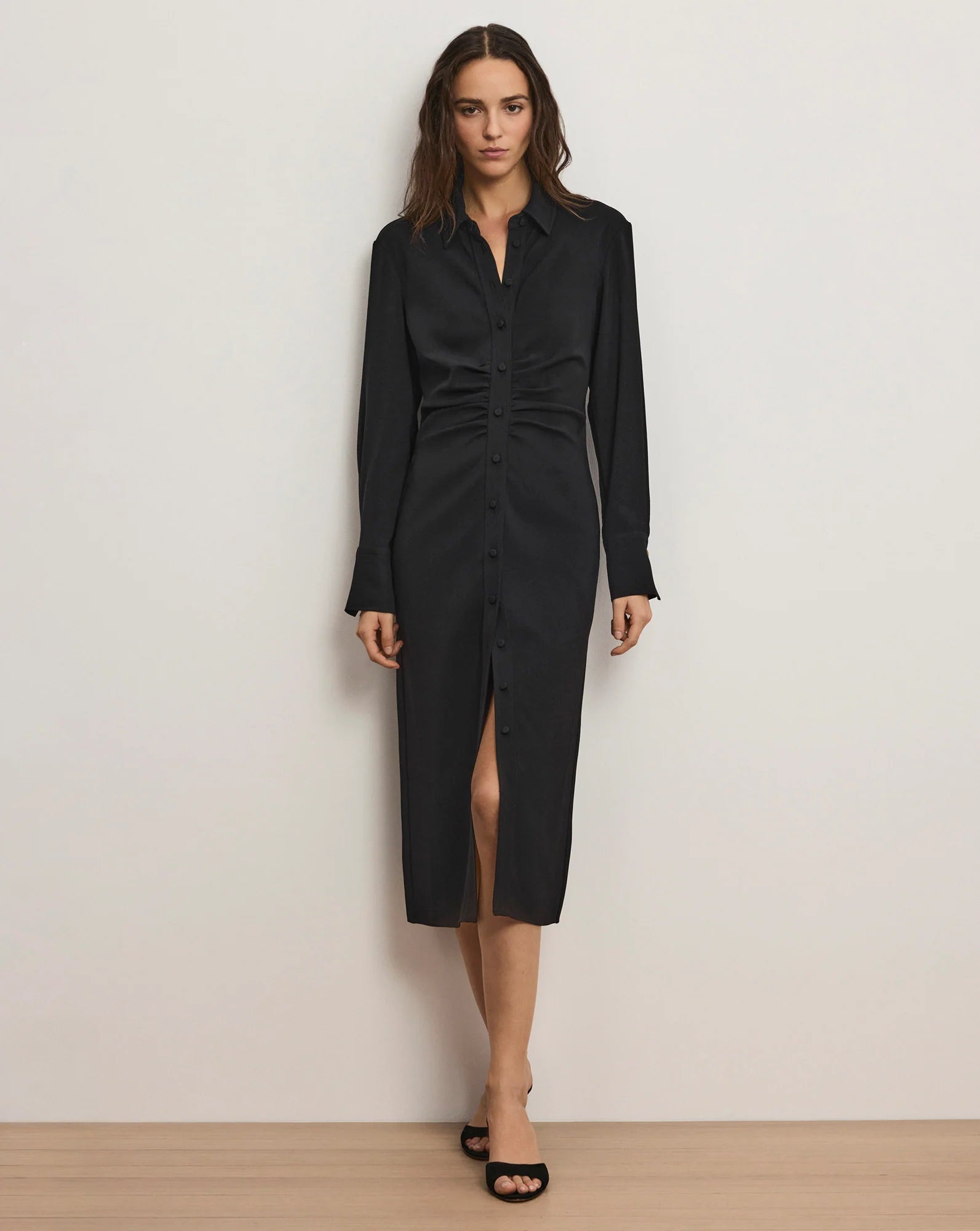 Effortless, yet elegant. The black Loxley dress reimagines the classic shirtdress with a ladylike silhouette, thanks to our signature ruching at the waist and back. Cut from lightweight stretch piqué crepe, it drapes gently on the body for an added dose of femininity. Finished with long sleeves, a collar, and a front slit, it's a versatile day-to-night look. Pair with pumps for the office, then switch to stilettos and a slim clutch for cocktails.