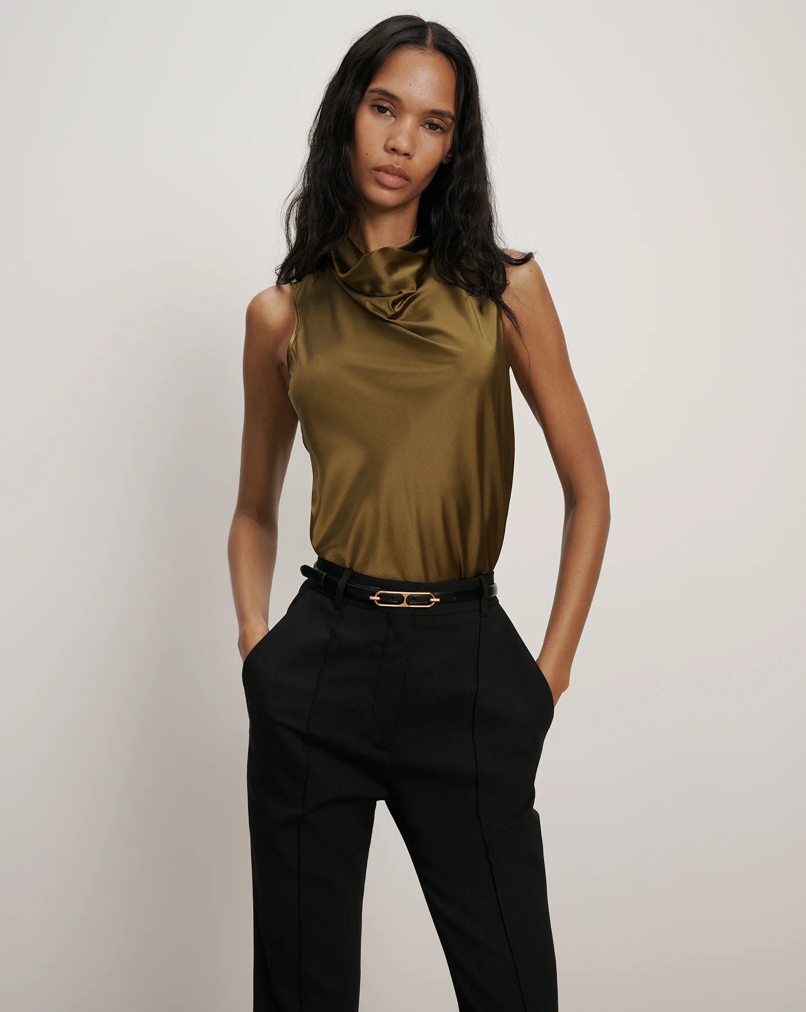 The silk top that does it all. With its slinky drape and elegant cowl neckline, the Tam is cut from moss green stretch silk and finished with a delicate keyhole back. Pair it with high-rise denim for after-hours ease, or go full glam with a sweeping maxi skirt.